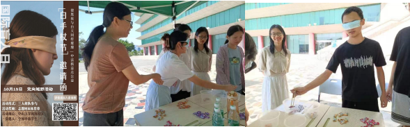 参赛者按照指定路线,在校园内各处打卡并完成各项与盲人相关的活动,在实践中体会盲人生 活的不易,学习在帮扶盲人时需要注意的礼仪。
