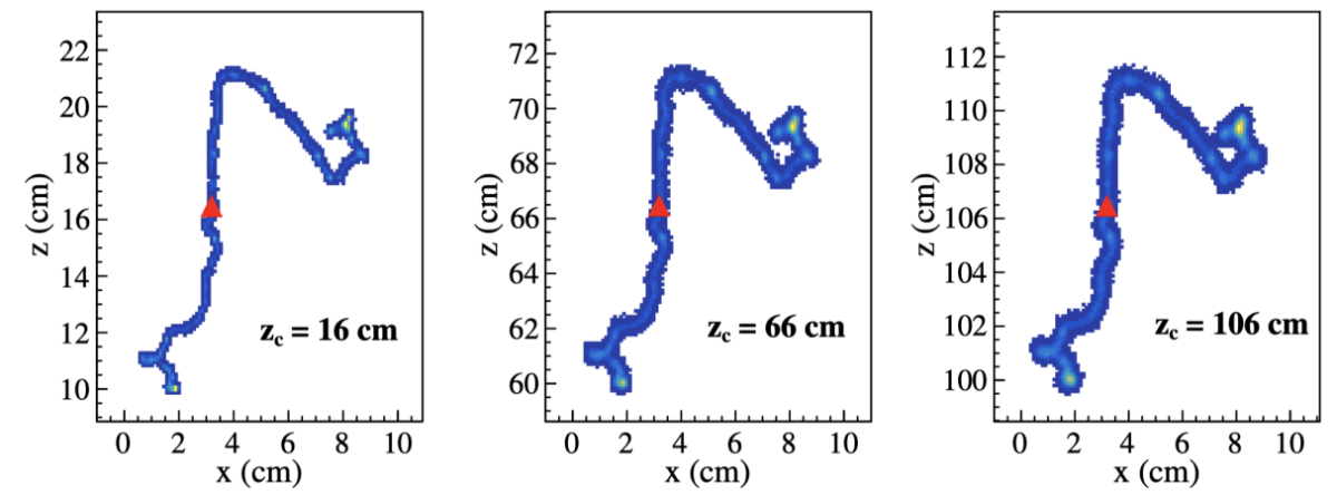 PandaX-III对闪烁光探测的缺失将导致无法获取探测器中的事例顶点,这将严重影响对探测器性能的理解和对无中微子双贝塔衰变探测灵敏度的提升。针对这一问题,李涛博士后首次提出使用卷积神经网络对探测器内事例顶点进行重建,表征了粒子径迹扩散特征与漂移距离之间的物理关系,为PandaX-III的顶点缺失提供了重要的解决方案(图三)。通过构建自定义的VGGZ0net回归模型,提取了事例顶点位置与其径迹在探测器内漂移过程特征的关联性,并基于不同探测器电子寿命条件下的蒙特卡洛模拟数据和PandaX-III原型机实验数据对该方法进行了研究和验证。该方法对事例顶点的重建精度可以达到11cm,探测器电子寿命的估计误差在1σ以内,能够大大提高探测器能量分辨率,从而提升PandaX-III寻找无中微子双贝塔衰变的灵敏度。