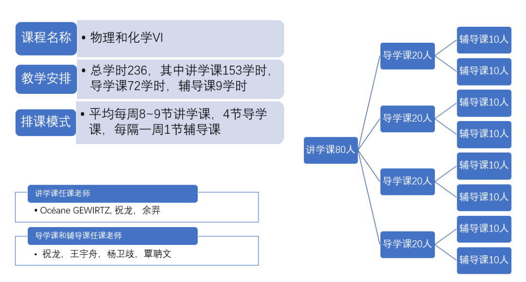 课程考核形式多样,包括常规的期末考试、每学期8-12次的小测、每学期2-3次的月考、以及创新性地从法国工科院校引进的持续一小时的展示型口试。教研组每周举行教学例会,讲学课和导学课老师互相听课、评课,最大程度地调动中方教师和法方教师,高质量地共同完成学院的教学工作。