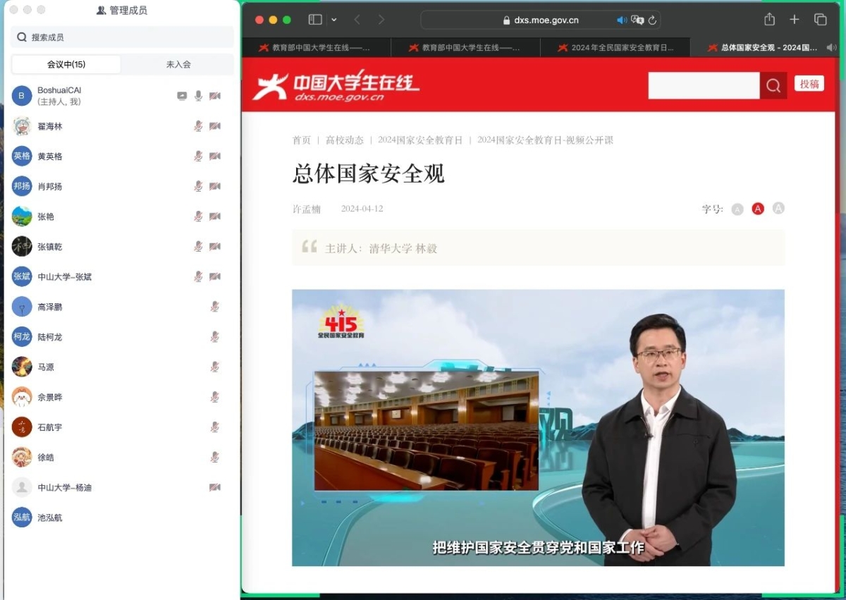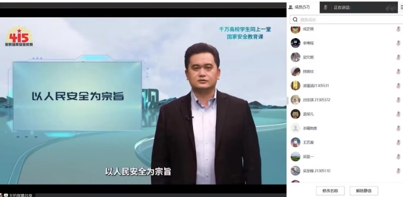 4月14日15时,我院组织各团支部、马克思主义学习小组和青马班通过“中国大学生在线”官网及“中国大学生在线”视频号、微博、B站等直播平台集体观看了教育部思政司指导组织开展的“千万高校学生同上一堂国家安全教育课”。 同学们学习了“总体国家安全观”、“经济安全”、“科技安全”等在内的九个专题。专家们结合现实实际,以生动真实的案例讲述了当前国家安全和保密工作面临的挑战,阐释了新时代国家安全的丰富内涵和外延,提醒同学们要不断提高防范和抵御安全风险的能力,增强全民国家安全责任。
