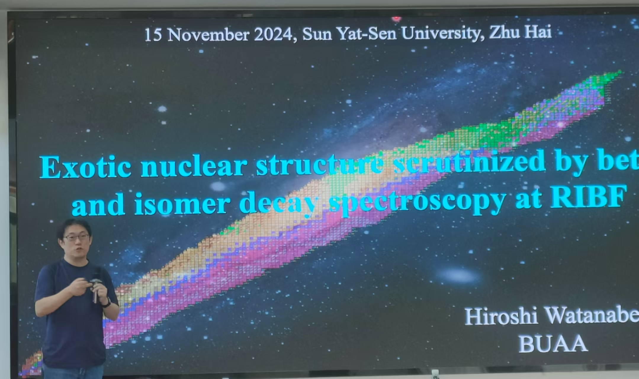 2024年11月15日,北京航空航天大学的Hiroshi Watanabe教授主讲“若海讲坛”第54讲《在放射性束工厂衰变谱学终端探究奇特原子核结构信息》。学院副院长袁岑溪教授主持讲座,Hiroshi Watanabe教授在讲座中分享了他在放射性衰变光谱领域的最新研究成果。