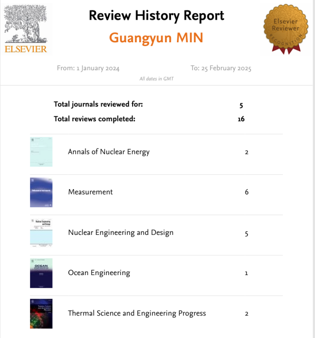 在科研项目中,闵光云同学作为主要完成人,积极参与导师主持的国家自然科学基金面上项目、广东省重点研发项目以及中核、广核等企业纵横向项目,共计6项,积累了丰富的研究经验。此外,他还受邀担任《Physical of Fluids》《Ocean Engineering》《Nuclear Engineering and Design》等期刊的审稿人,其学术水平得到广泛认可。
