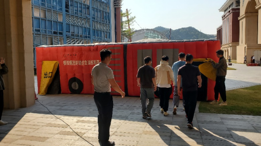本次活动的最后一个环节是模拟火场逃生与灭火演习。灭火实操区,师生们分组实战,在消防员指导下规范操作干粉灭火器与二氧化碳灭火器。掌握“提、拔、握、压”四步要诀后,参训者果断按压,干粉喷涌精准扑灭模拟火源。“烟热逃生帐篷” (一种模拟火灾现场的逃生训练设备)的体验则让人身临其境感受火灾险情。帐篷内烟雾弥漫,能见度几乎为零,参与者紧贴墙壁,弯腰屏息艰难前行。在伸手不见五指的黑暗中,仅能依靠触觉辨识逃生标识,真实还原了火灾现场的极端环境。此次模拟让师生们深刻体会到火灾的残酷性,更切实掌握了浓烟环境下的逃生技能,为应对真实险情积累了宝贵经验。