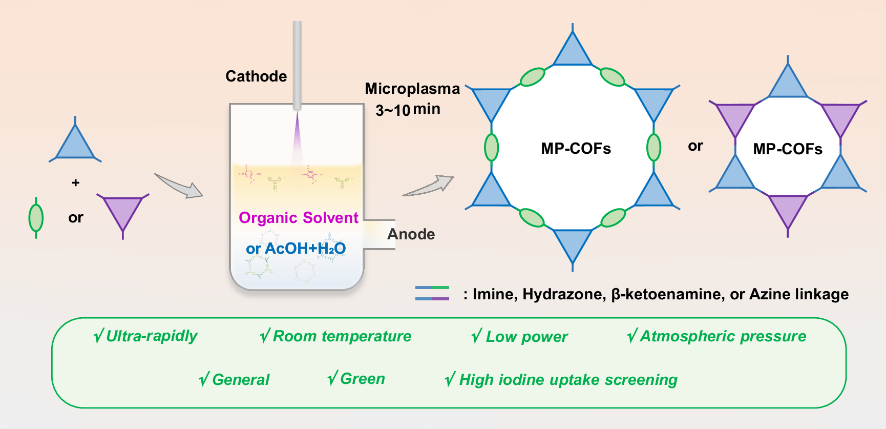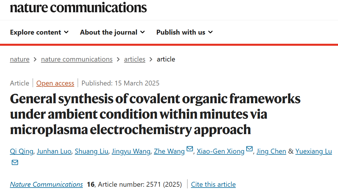 近日,国际著名综合性期刊《自然×通讯》(Nature Communications)在线发表《General synthesis of covalent organic frameworks under ambient condition within minutes via microplasma electrochemistry approach》的研究论文。该研究报道了一种采用微等离子体电化学方法(MIPEC)合成共价有机框架(COFs)的新方法,该方法较传统的溶剂热法所制得的COFs相比具有更大的比表面积。实验和理论计算均显示研究中所合成材料对挥发性碘具有较好的吸附性能,为筛选用于吸附放射性碘的COFs提供了一种快速合成方法。