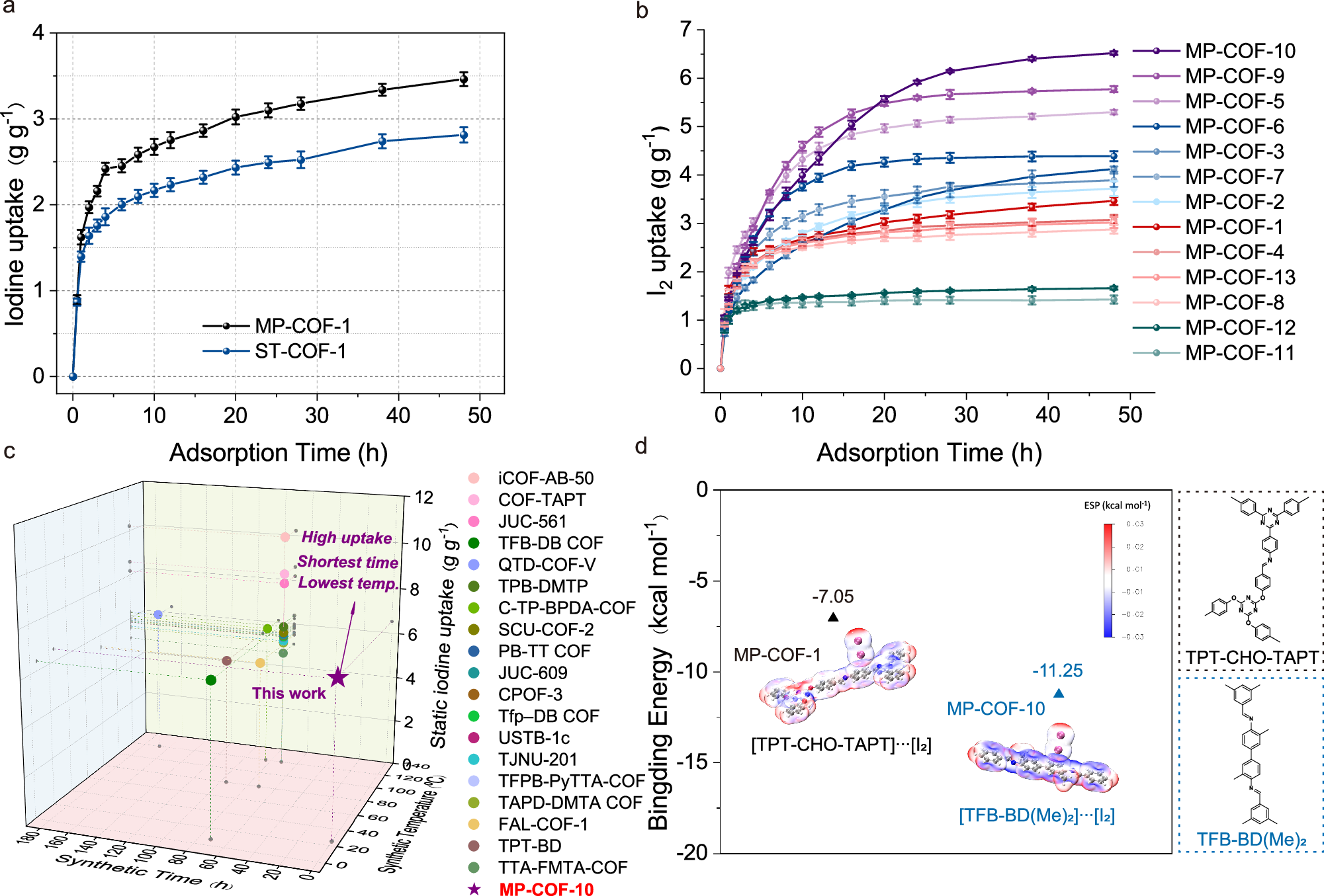 研究中所合成的13种COFs材料对碘均具有较好的捕获能力(图三)。一般认为高比表面积和孔体积有利于碘的吸附,而MP-COF-10在候选材料中尽管具有较低的比表面积,在候选材料中却具有最高的吸附能力。基于密度泛函理论的计算发现MP-COF-10的高吸附性能主要源自于其较高的吸附能(-11.25 kcal/mol),同时在吸附过程中发生了电荷转移从而形成聚碘阴离子。基于在碘吸附材料筛选上的优异表现,我们相信, MIPEC方法由于其高效性、通用性以及环境友好性,不仅在温和条件下制备先进晶体材料方面极具吸引力,同时该方法为高通量筛选以及开发适用于各种特定应用的新材料提供了重要契机。