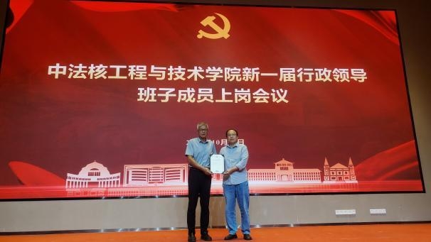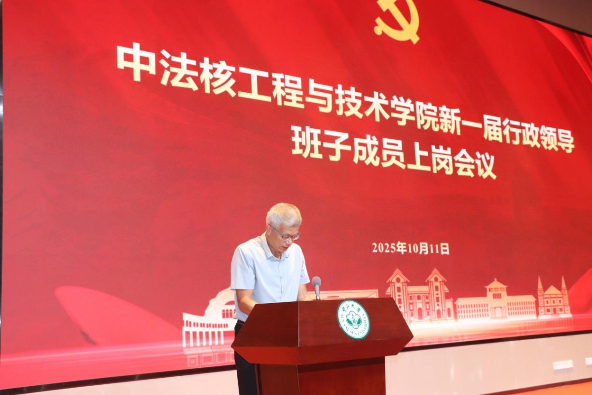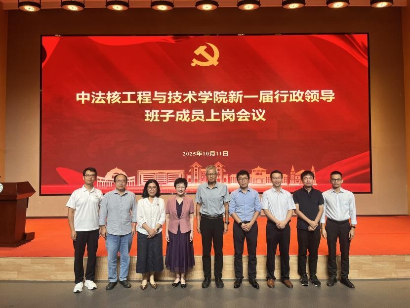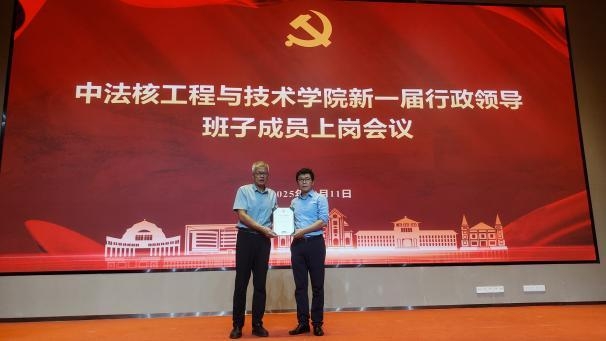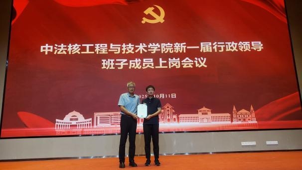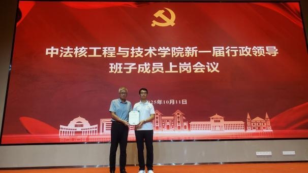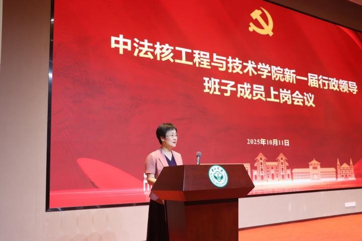 王为院长代表新一届行政班子作履新发言,对学校及学院师生的信任表示感谢。他表示上一届任职期间紧密围绕国家核能安全与清洁能源发展战略,构建了中法融合、协同育人的多元多层次人才培养体系,梳理明晰了学科布局,持续服务国家重大需求。面向“十五五”新阶段,他表示将进一步深入贯彻党和国家关于教育、科技、人才工作的总体部署,持续强化中法合作办学特色,推动核科学与工程学科交叉融合,建设高水平科研与教学平台,提升学院治理体系和治理能力现代化水平。