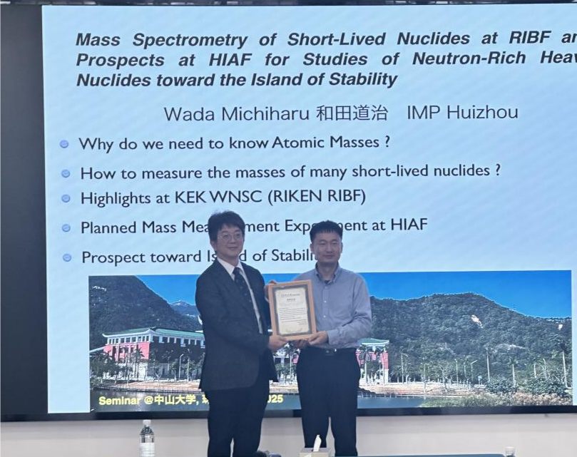 2025年12月8日,我院成功举办了若海讲坛第89讲,特邀中国科学院近代物理研究所访问教授、日本理化学研究所(RIKEN)前资深研究员 Michiharu Wada教授作题为《在RIBF开展的短寿命核素质谱研究及HIAF展望:探索超重稳定岛》的精彩学术报告。本次讲座由我院副院长袁岑溪教授主持。