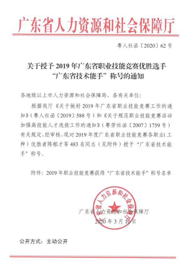 最近,广东省人力资源和社会保障厅发布《关于授予2019年广东省职业技能竞赛优胜选手“广东省技术能力”称号的通知》。我院2018届校友徐昌恒荣获“广东省技术能手”称号。