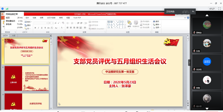 2020年5月23日,研究生第一党支部举行了组织生活。本次会议采用腾讯会议方式进行。