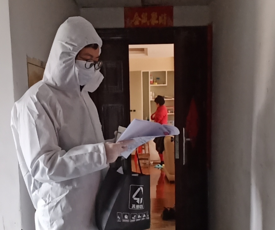 2月20日之后,李金霖开始和另外一个市直机关党员承包楼栋,负责上门核查统计两栋楼共99户居民的情况。他们每天上门挨家挨户地敲门,询问每一户的家庭成员信息,登记武汉返回人员及其密切接触人员,对无人的房子贴上封条并每日检查。对每户家庭的每个人进行体温登记,对于重点关注人员还要每日上门测量体温。对于只有老人小孩的家庭,则每天上门询问身体状况及物资需求,为有需要的家庭及时发放防疫物资。在每天上门服务时,李金霖都会穿防护服戴口罩。刚开始,居民对上门服务志愿者也存在防备心理,不愿意开门配合体温测量和登记的工作,但看到了他们一天天的辛苦付出以后,也逐渐消除了戒备心理,积极配合他们的工作。除了小区物业隔几天对楼道进行消毒,居民也会每天对自家门前进行消毒,为上门服务的志愿者提供了一层安全保障。