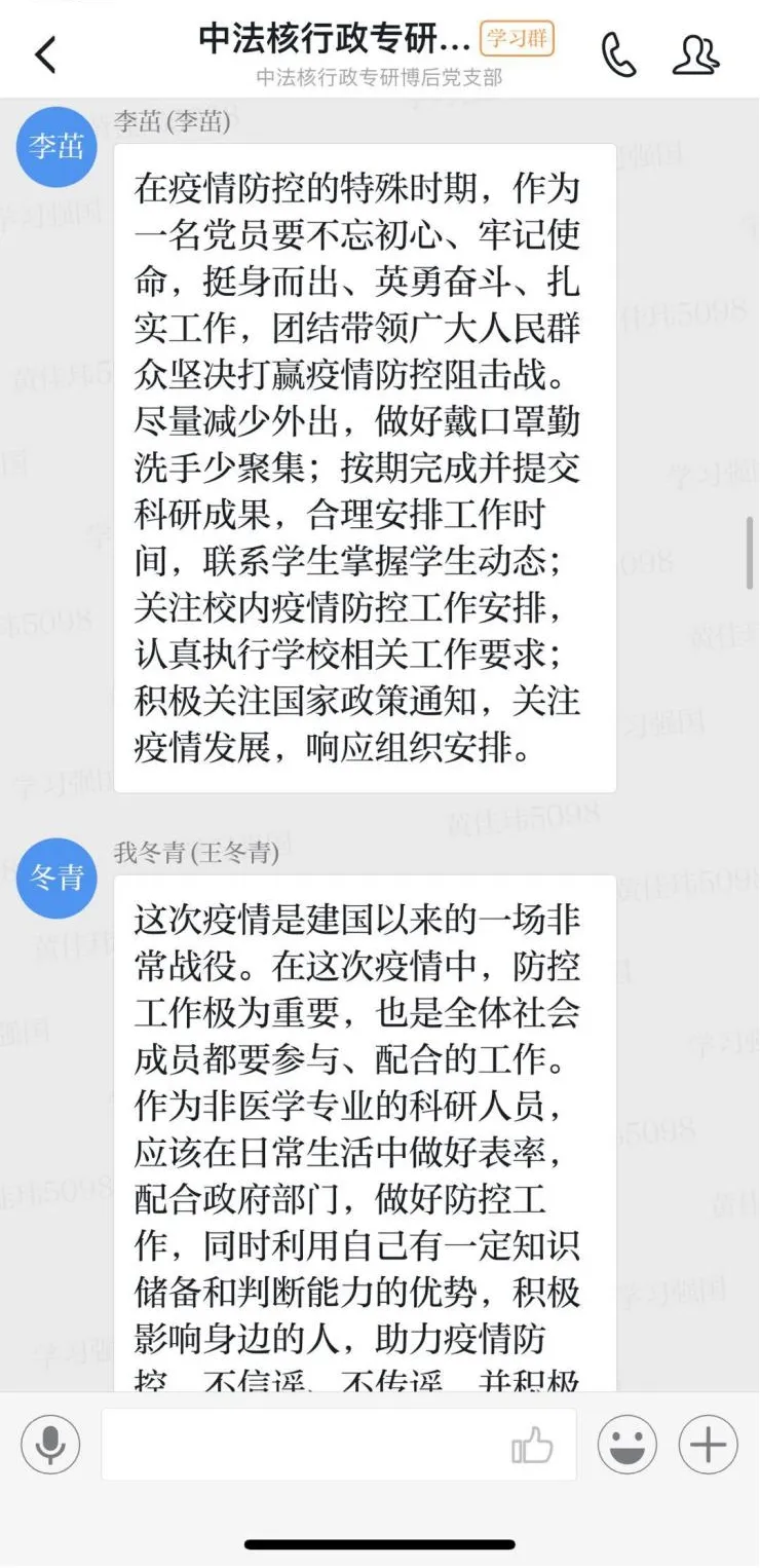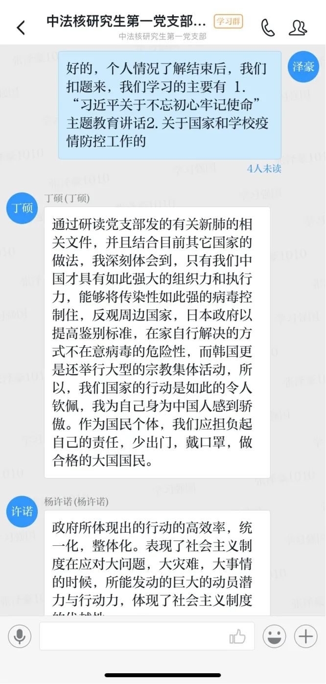 会议中,大家分别就相关资料的学习谈了各自的体会。研究生第二党支部书记谭志城谈到,在这个国家的特殊时期,更要起到党员的模范带头作用,以身作则,发挥党员的先进性。为了达到这个目标,我们支部内组织了多次关于防疫的组织活动安排以及防疫知识的学习。在这个时期,党员不只要自身做好防控,更要坚信防疫工作必将成功,用话语和行动鼓舞周边的人。教师党支部书记卢亮教授在发言中提到,我们要做“像样”的党员,不甩袖子,不做样子,不添乱子,不传谣不造谣,关键时刻能站出来;我们党员干部要遵守疫情期间规定、不聚会、少外出,切实落实政策;我们更要带头开展正面宣传,及时发现和处置不实信息,对散播谣言的行为坚决抵制和纠正。要让人民相信有我们党员在,疫情不再可怕。