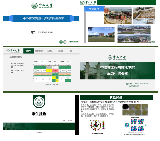 学院的优秀研究生代表翟海林同学、施宏宇同学向营员们展示了中法核学院的学习科研生活和课余生活。学院地处三面环山、一面朝海的珠海校区,风景宜人,拥有一流的教学资源和科研平台,将为营员们提供绚丽多彩的学习和研究生活。学院也邀请了夏令营营员代表李亚瑞同学向大家展示了自己的科研经历,讲述了对核燃料专业的理解和对自己读研的规划,让营员们可以更好地规划自己的研究生生活。