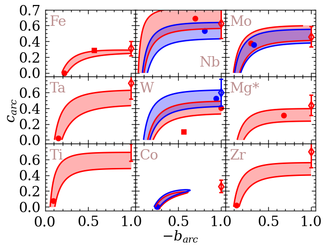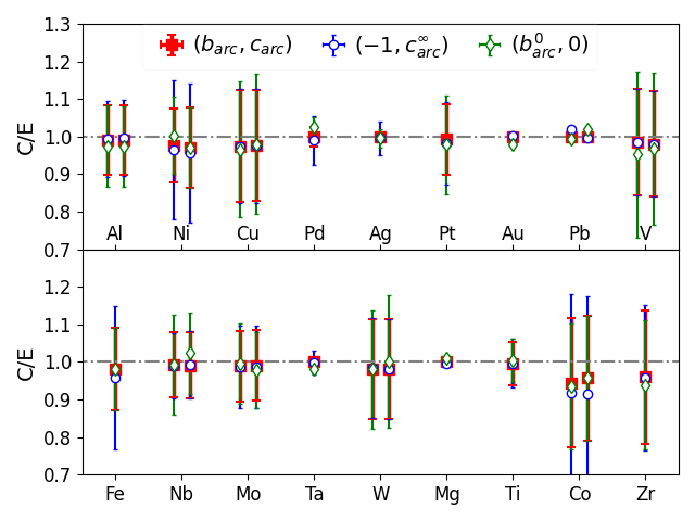 本研究借助已有的中子辐照数据,通过材料点缺陷与电阻率变化之间的关系获取若干能谱下的中子辐照点缺陷数据。基于这些数据对近年基于分子动力学模拟提出的唯象点缺陷模型(arc-dpa)进行参数评估,获得两个基本参数的范围(如图1所示)。
