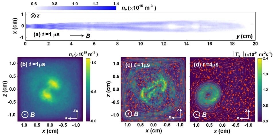 2025年8月,核聚变与等离子体研究团队在弱磁化等离子体自组织过程研究中取得突破性进展,研究发现了轴向磁场约束下等离子体自发形成的一种全新三维螺旋形旋转结构,并揭示了其演化特性与形成机制,为已有的实验观测提供了全新的分析角度。该成果以“Three-Dimensional Helical-Rotating Plasma Structures in Beam-Generated Partially Magnetized Plasmas”为题在线发表于国际著名期刊《物理评论快报》(Physical Review Letters)上。