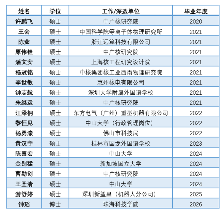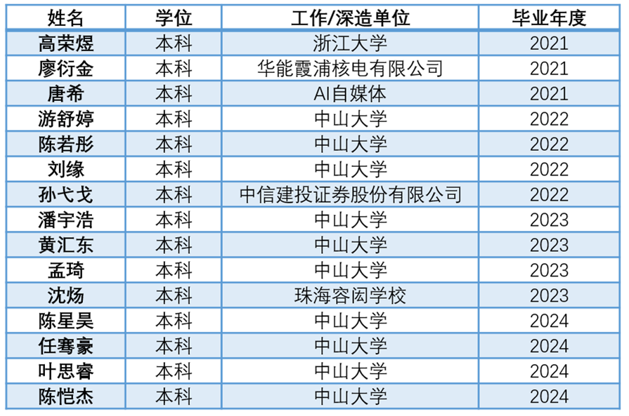 钟瑶(博士)、游舒婷(硕士)、金别猛(硕士)、曹勤创(硕士)、王圣清(硕士)、陈嘉宏(硕士)、黄汉宇(硕士)、江泽桐(硕士)、黎恒见(硕士)、杨勇濠(硕士)、王会(硕士)、陈茹(硕士)、原伟铨(硕士)、潘文安(硕士)、杨冠铭(硕士)、李世敏(硕士)、钟志航(硕士)、朱继运(硕士)、许鹏飞(硕士)、陈若彤(本科)、刘缘(本科)、孙弋戈(本科)、游舒婷(本科)、沈炀(本科)、潘宇浩(本科)、黄汇东(本科)、孟琦(本科)、陈星昊(本科)、任骞豪(本科)、叶思睿(本科)、陈恺杰(本科)、唐希(本科)、高荣煜(本科)、廖衍金(本科)。